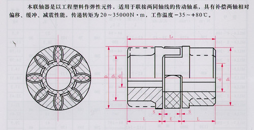 本聯(lián)軸器是以工程塑料作彈性元件,適用于聯(lián)接兩同軸線的傳動軸系,具有補(bǔ)償兩軸相對偏移、緩沖、減震性能,傳遞轉(zhuǎn)矩為20——35000N.m,工作溫度-35_+80℃